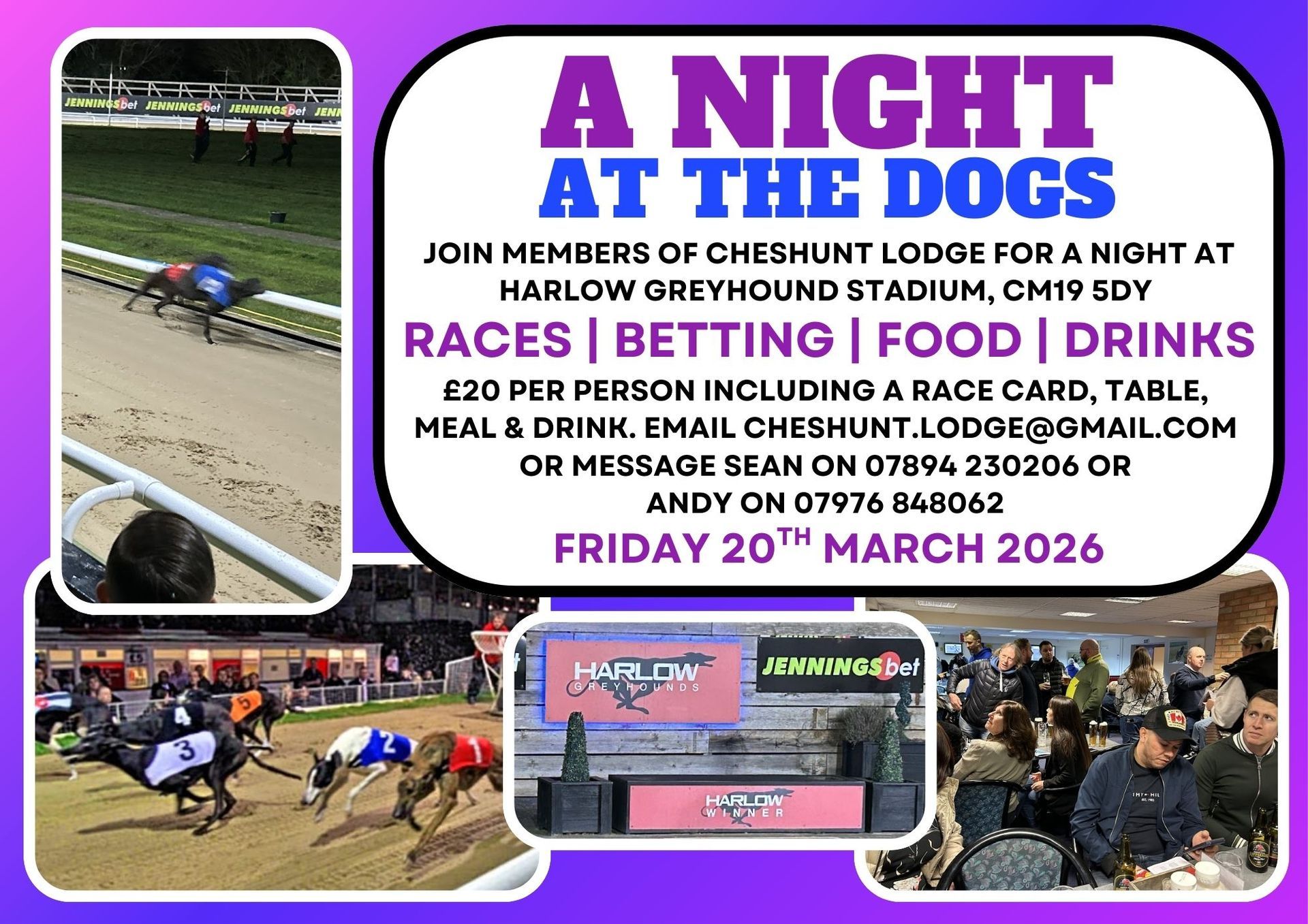 Since 2024, the Lodge has held a night at Harlow Dogs. It's a purely social occasion when brethren, family and friends gather from 5.30pm at the track, which is centrally located geographically for the members of the lodge. Everyone get a race card and programme, a free tote bet, and a classic pub meal and a alcoholic or soft drink. The racing takes place from 6pm - 9pm, and a bar is available. It's a really good evening. Children are also welcome. Any proceeds from the ticket sales go to lodge funds.